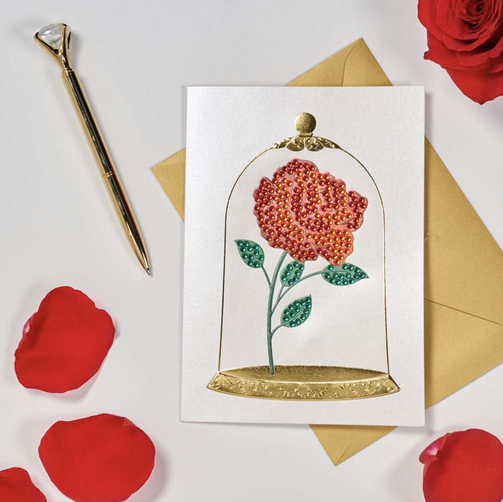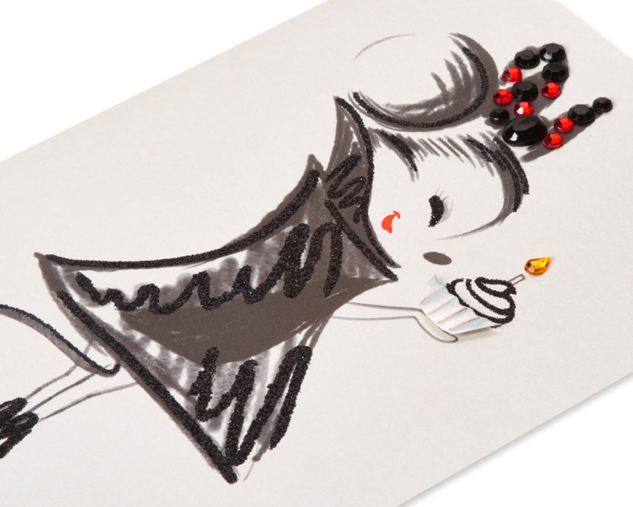 Card production spanned layout and art retouching, specialty die-cuts, typography, color correction, layered paper attachment build out, foil, glitter and sculpted emboss plate build. Often, custom materials such as gems, beads, ribbon, felt, tule, embroidered fabric, vellum, acetate, flocking, faux leather and fur were added.